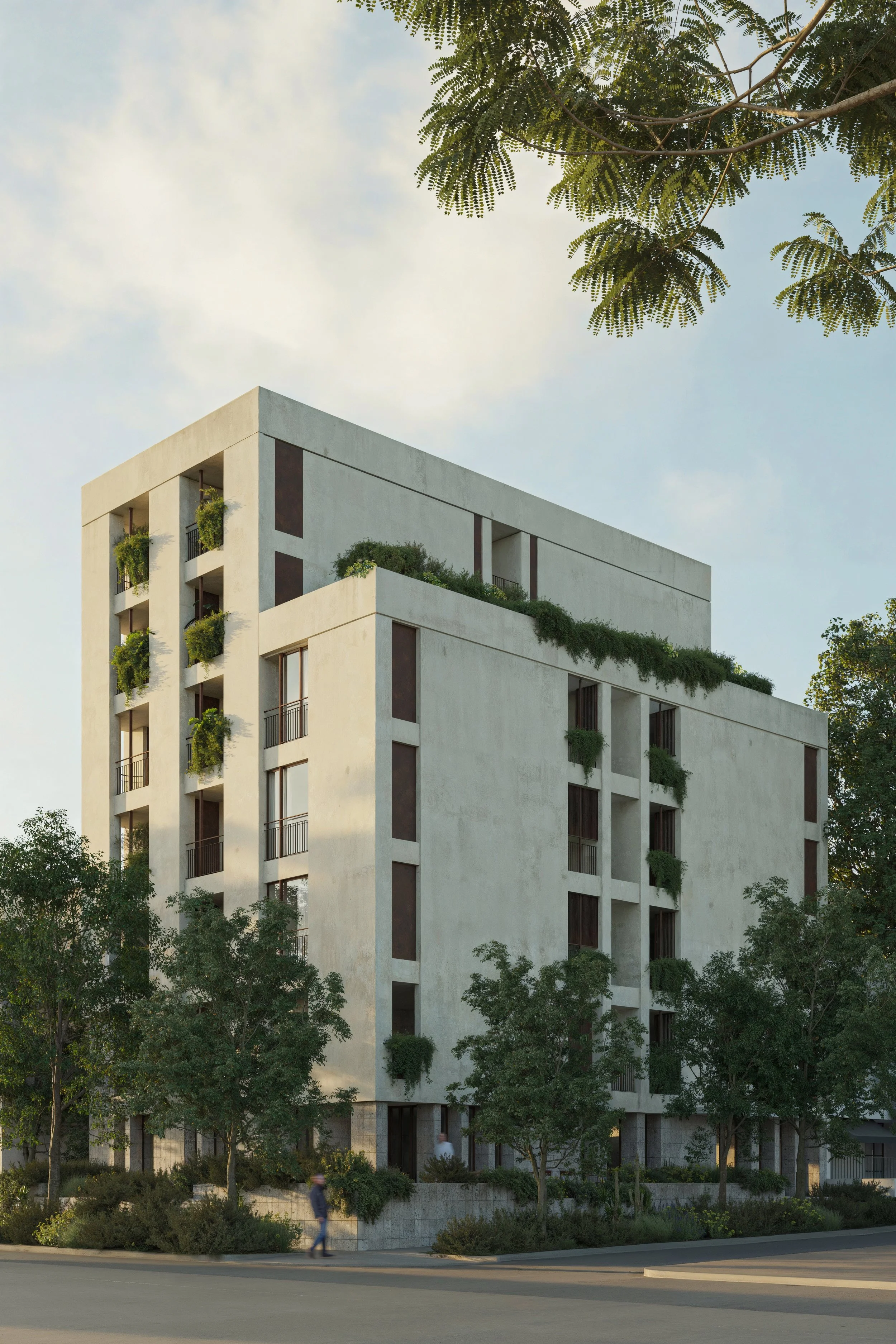 Diseñado por Ana Victoria Pérez-Gil y Saúl Figueroa, con paisajismo de Taller BAC, el proyecto utiliza materiales nobles—cantera, estuco, herrería al óxido—que envejecen con el entorno y celebran la vida del barrio.